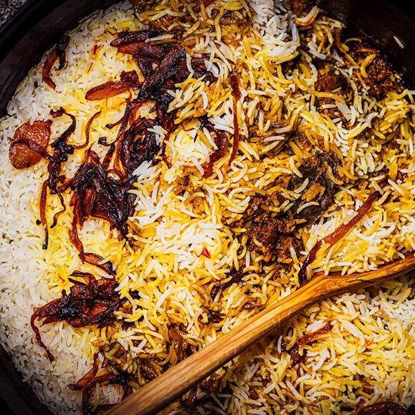 Tender pieces of goat meat cooked with fragrant basmati rice, and a blend of spices.