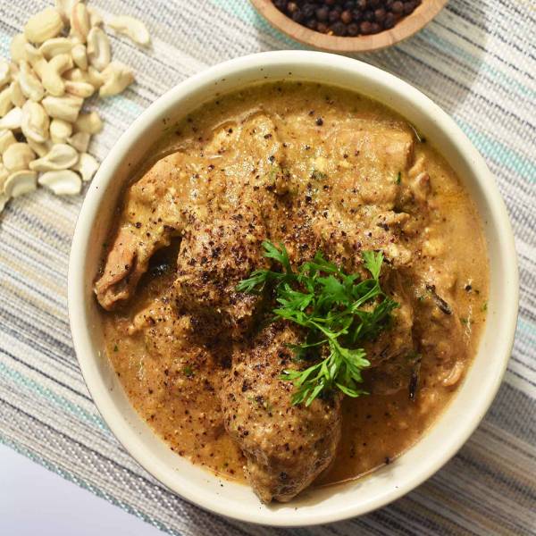 Juicy chicken cooked in a velvety sauce of yogurt, fragrant spices, and cashew nuts, offering a mild yet flavourful creamy dish.