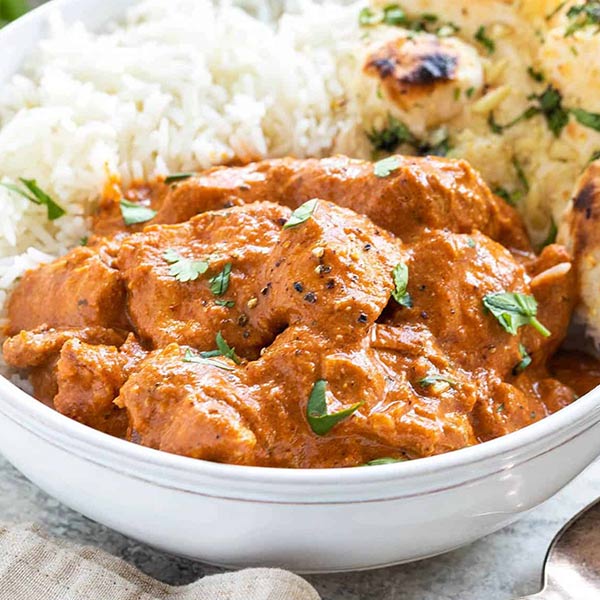 Chicken cooked in a rich gravy made from tomato cream, onions, garlic, and our very homemade garam masala.